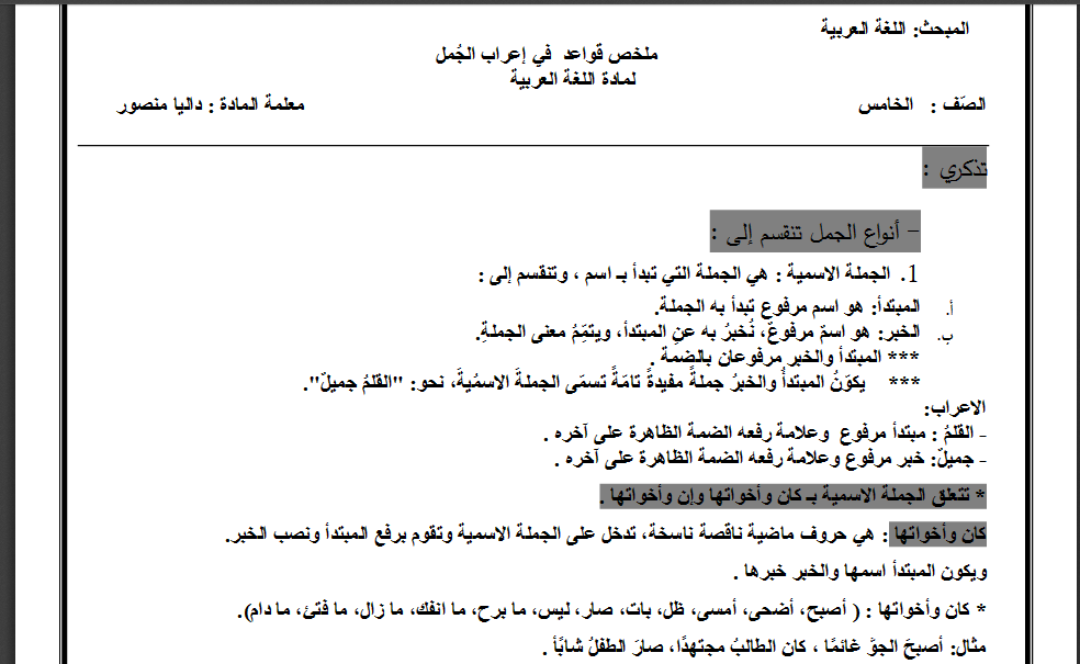ملخص قواعد في إعراب الجمل لمادة اللغة العربية للصف الخامس منتديات صقر الجنوب