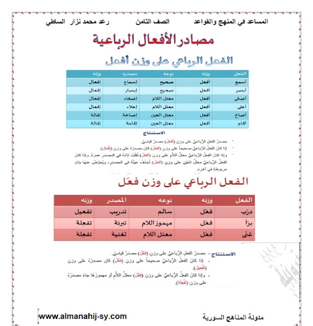 شرح درس مصادر الافعال الثلاثية والرباعية في اللغة العربية للصف الثامن الفصل الثاني