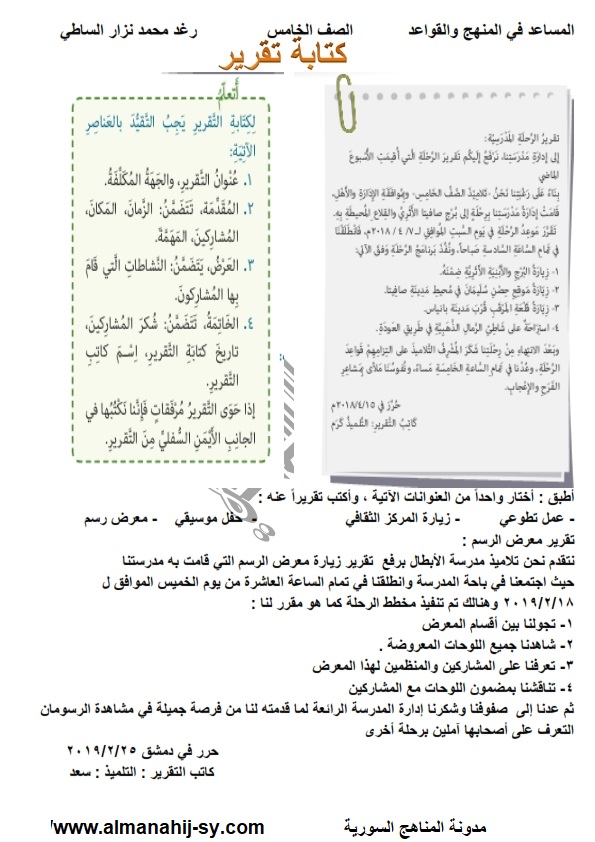 شرح كتابة تقرير لغة عربية صف خامس فصل ثاني