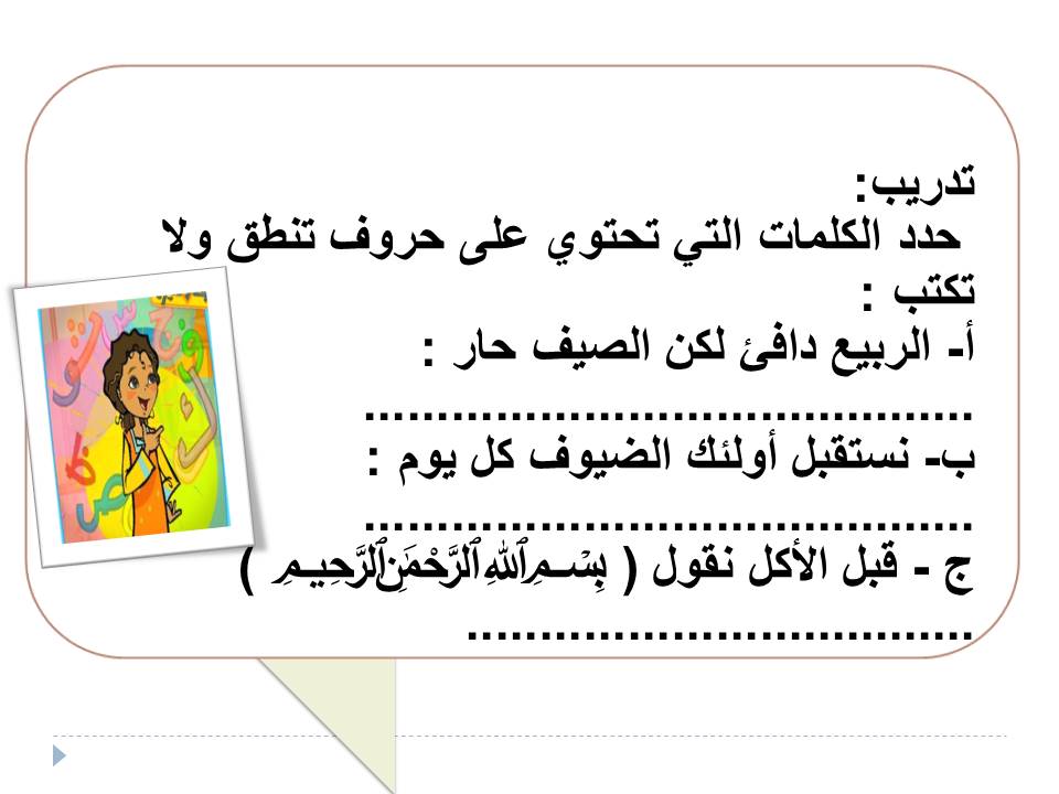 ورقة عمل حروف تنطق ولا تكتب لغة عربية للصف الثالث إعداد عبير منصور مدرستي الكويتية
