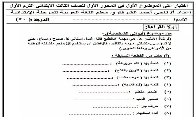امتحان لغة عربية الصف الثالث الابتدائي اخر العام محافظة الاقصر