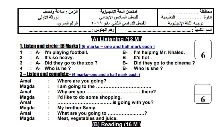 نماذج إمتحانات اللغه الانجليزيه للصف السادس الابتدائي لمستر علي الهاروني