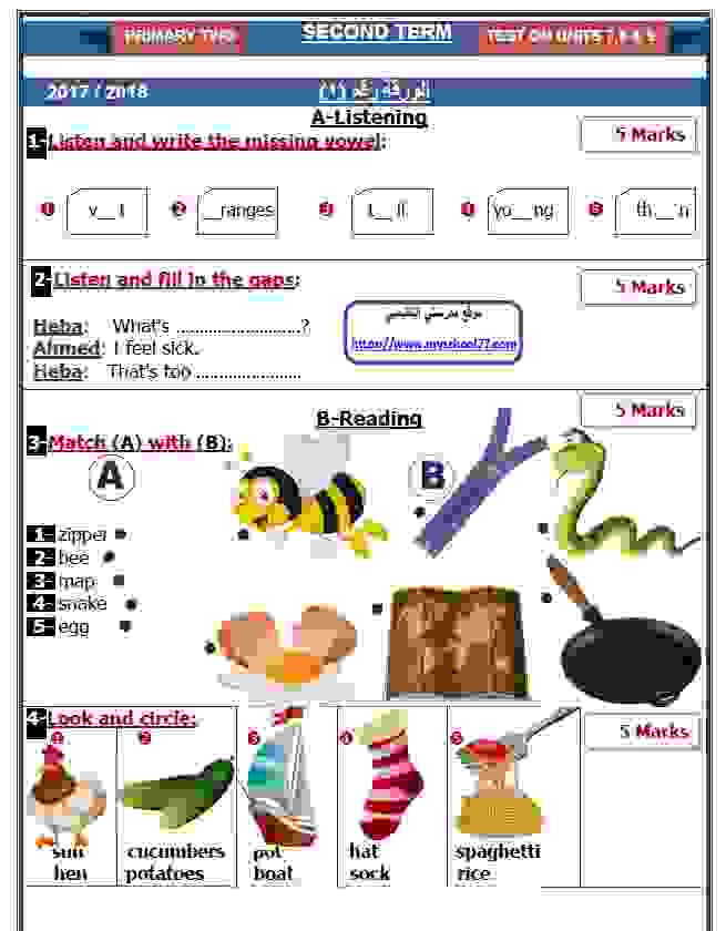 امتحانات لغة انجليزية على أول ثلاث وحدات من الصف الثاني الى السادس الابتدائي ترم ثاني مواصفات2018