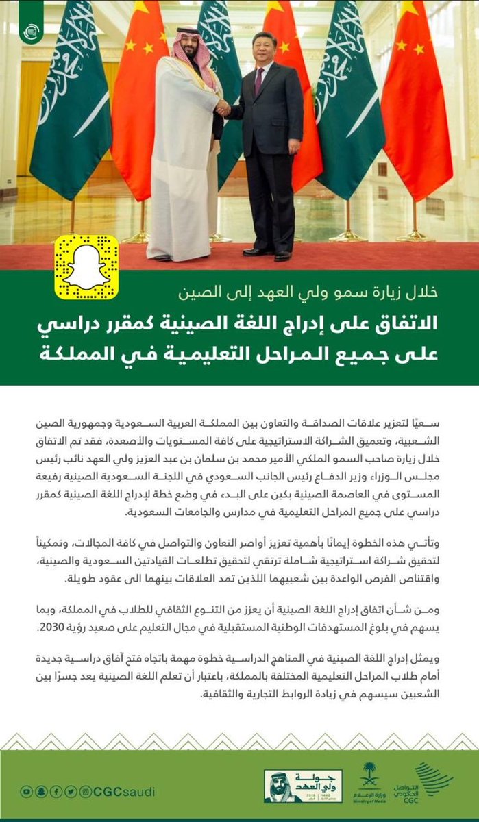 عام خلال زيارة سمو ولي العهد الاتفاق على البدء في وضع خطة لإدراج اللغة الصينية كمقرر دراسي في المراحل التعليمية بالمملكة وكالة الأنباء السعودية