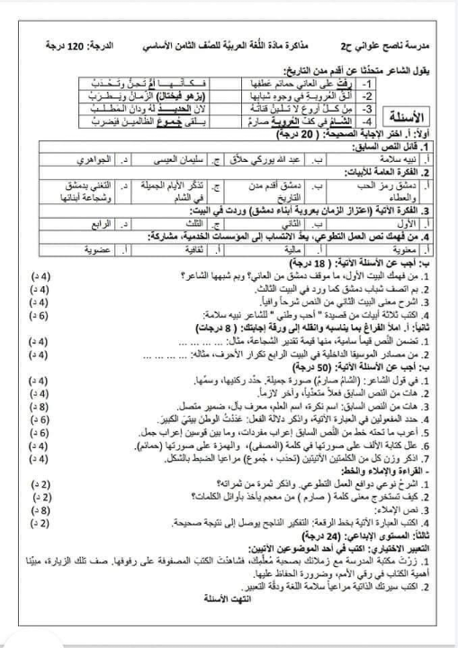 نموذج اختبار اللغة العربية للصف الثامن منصة أونلاين التعليمية السورية Facebook