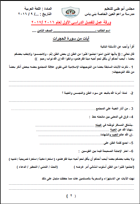 مدونة تعلم أوراق عمل الوحدة الاولى لغة عربية للصف الثامن الفصل الدراسي الاول 2017