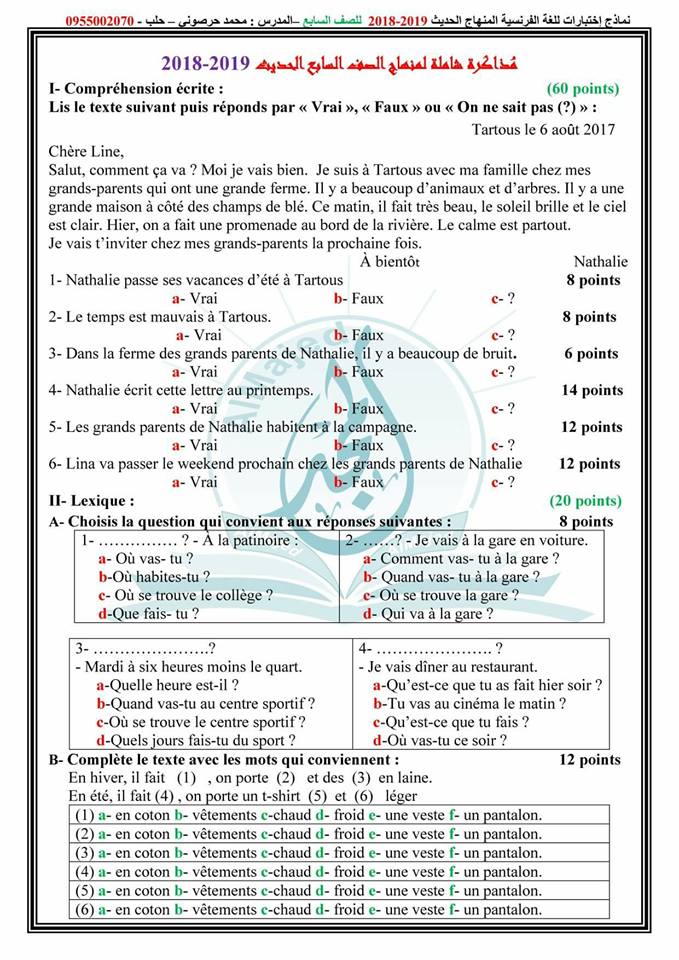 اختبار في اللغة الفرنسية للصف السابع الفصل الاول المناهج الجديد 2018 2019