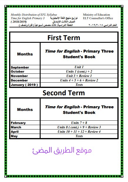 Time For English توزيع المنهج والأهداف للمرحلة الابتدائية بالكامل من الصف الأول حتى الصف السادس الابتدائي لعام 2017 2018