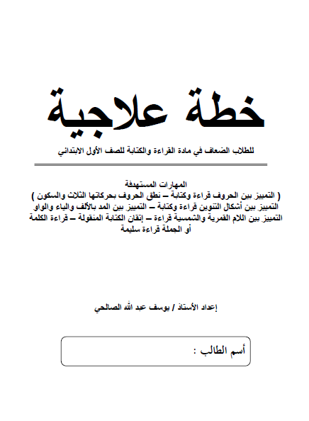 اللغة العربية أوراق عمل خطة علاجية لمهارات القراءة والكتابة للصف الأول ملفاتي