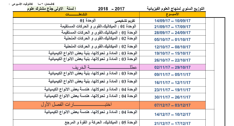 التوزيع السنوي الفيزياء للسنة الاولى ثانوي جذع مشترك علوم