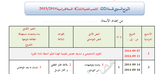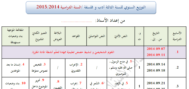 التوزيع السنوي اللغة العربية للسنة الثالثة ثانوي اداب مدونة التعليم والتربية
