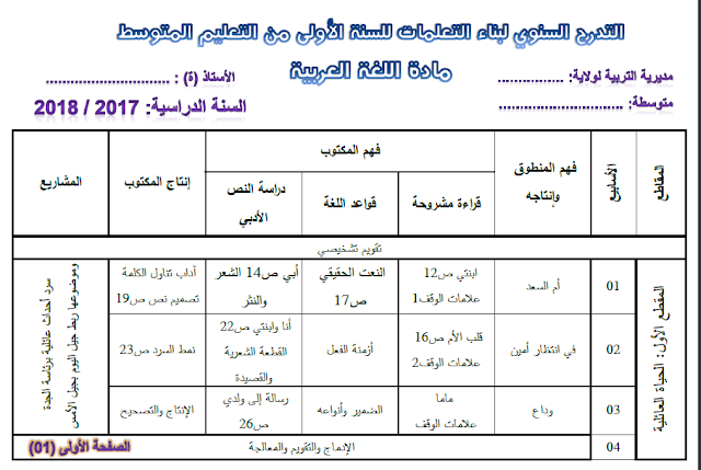 التدرج السنوي لتعلمات اللغة العربية والتربية الإسلامية للأولى متوسط موقع الدراسة الجزائري