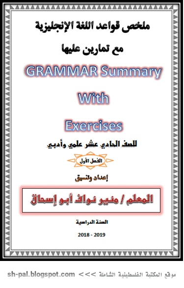 ملخص قواعد اللغة الانجليزية مع تمارين عليها للصف الحادي عشر الفصل الأول المكتبة الفلسطينية الشاملة