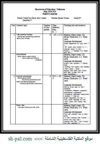خطة فصلية في اللغة الانجليزية للصف التاسع الفصل الثاني المكتبة الفلسطينية الشاملة