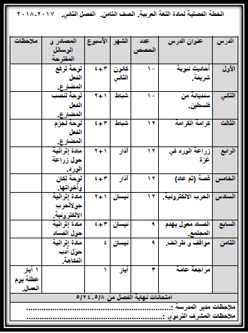 خطة فصلية في اللغة العربية للصف الثامن الفصل الثاني المعلم الفلسطيني