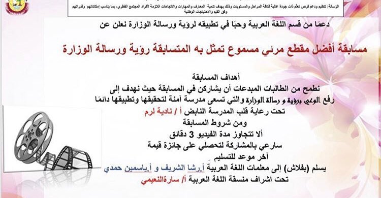 Amna Bint Wahab Prep Pa Twitter مسابقة افضل مقطع مرئي مسموع تمثل به المتسابقة رؤية ورسالة الوزارةيقدمها قسم اللغة العربية في مدرسة آمنة بنت وهب الاعدادية Https T Co Qfk1tw35jp