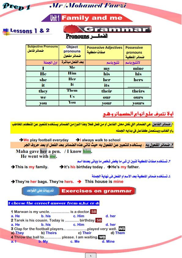 مذكرة قواعد اللغه الانجليزيه للصف الاول الاعدادي الترم الاول 2021 شرح وتدريبات جرامر أولى اعدادي لمستر محمد فوزى