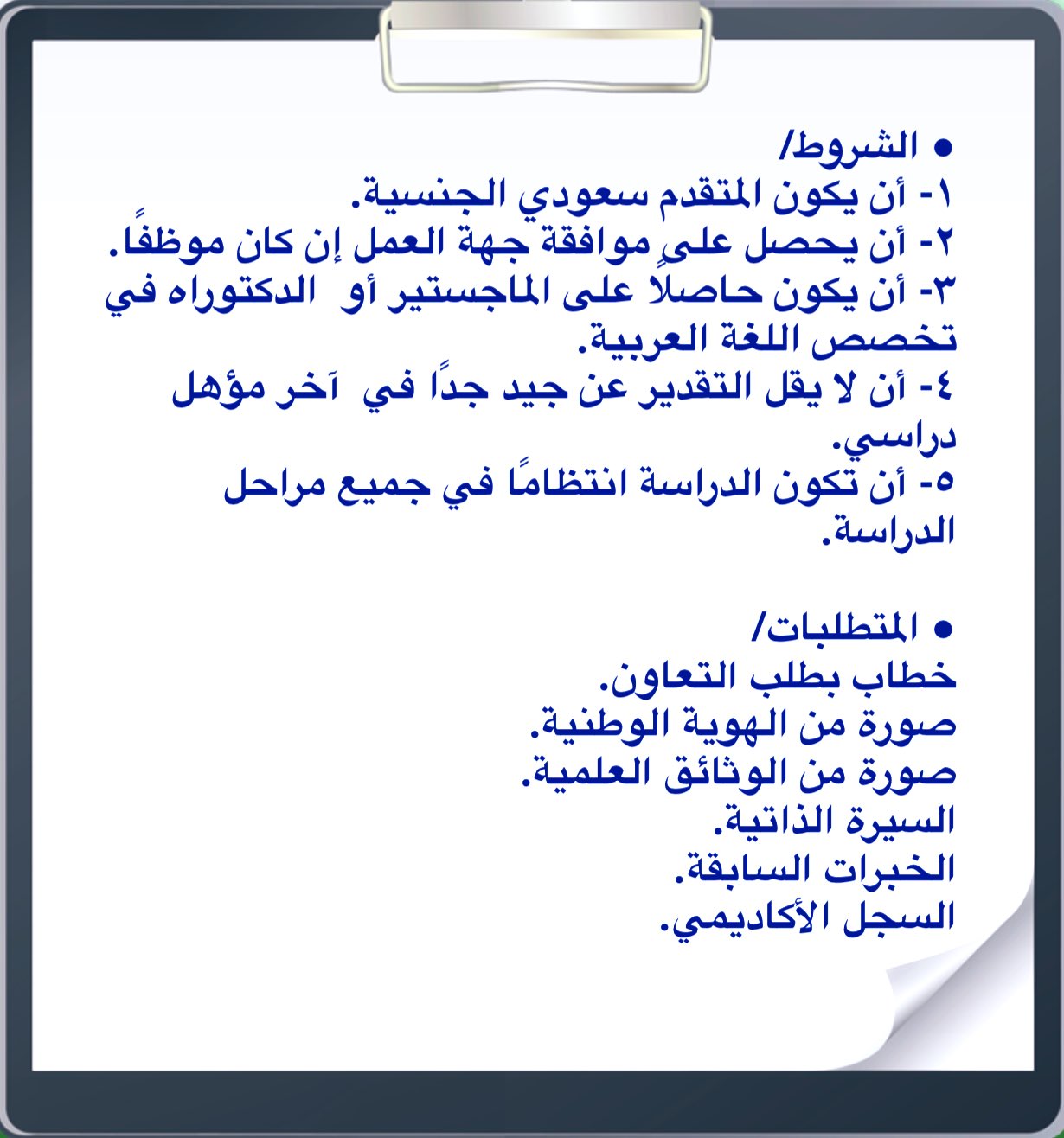كلية اللغة العربية On Twitter تعلن كلية اللغة العربية عن حاجتها إلى متعاونين ومتعاونات في تدريس بعض المقررات الدراسية للفصل الدراسي الأول للعام الجامعي ١٤٤٢هـ في شطري الطلاب والطالبات وفق ا للشروط والمتطلبات المرفقة Https T Co Woy63zeyyv