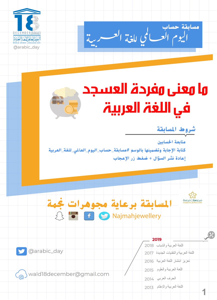 اليوم العالمي للغة العربية No Twitter شارك في المسابقة واكسب الذهب ما معنى مفردة العسجد في اللغة العربية شروط المسابقة متابعة الحسابين Arabic Day و Najmahjewellery كتابة الإجابة وتضمينها