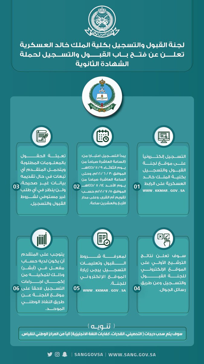 رواد قياس On Twitter أعلنت لجنة القبول والتسجيل بـ كلية الملك خالد العسكرية التابعة لـ وزارة الحرس الوطني عن موعد فتح باب التسجيل لخريجي المرحلة الثانوية عبر الموقع الالكتروني Https T Co Zrkwmyocsl من يوم الثلاثاء الساعة الـ١٠