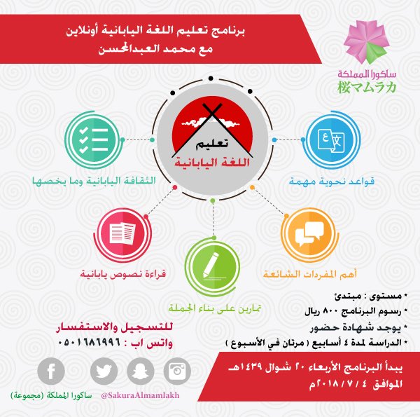 O Xrhsths ساكورا المملكة 桜マムラカ Sto Twitter بدأ التسجيل لبرنامج تعليم اللغة اليابانية التابع ل ساكورا المملكة المقاعد محدودة والأولوية في الاعتماد عندالدفع رابط التسجيل في البروفايل ويمكنكم التواصل على الواتس اب لتزويدكم بوسائل