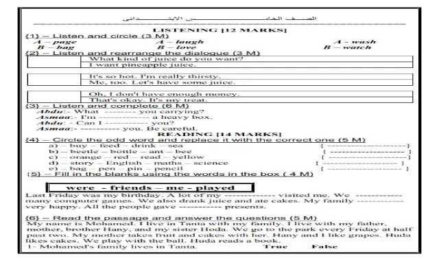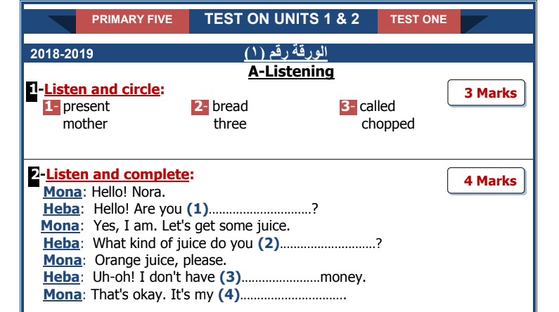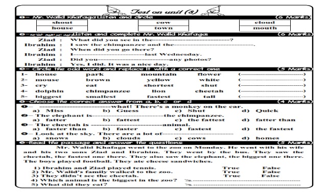 تحميل امتحان علي الوحدة الاولي والثانية انجليزي للصف الخامس الابتدائي 2019 ترم اول