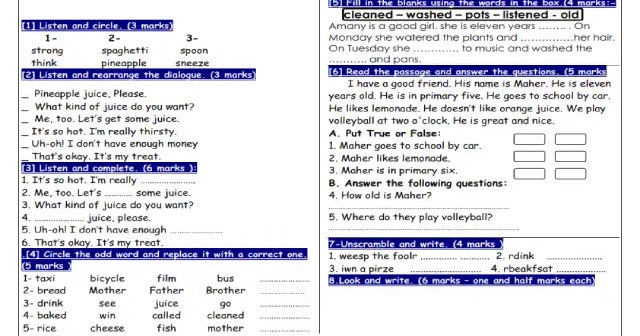 امتحان اللغة الانجليزية للصف الخامس الابتدائي المواصفات الجديدة ترم أول