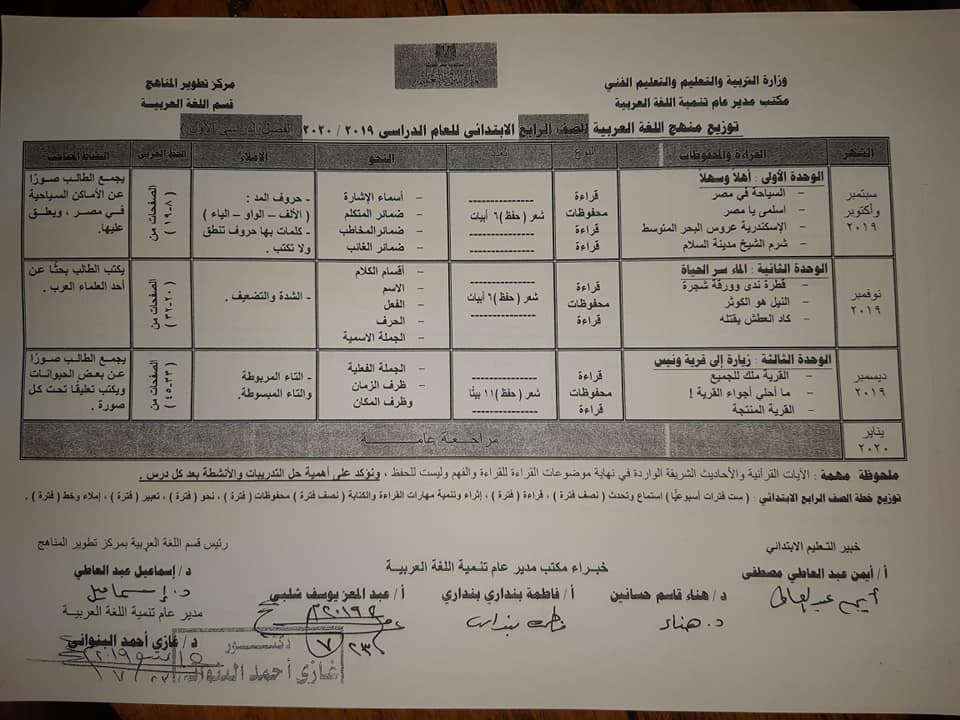 جدول توزيع اللغة العربية للمرحلة الابتدائية نسخ الوزارة جميع الصفوف الفصل الدراسى الاول والثانى 2020