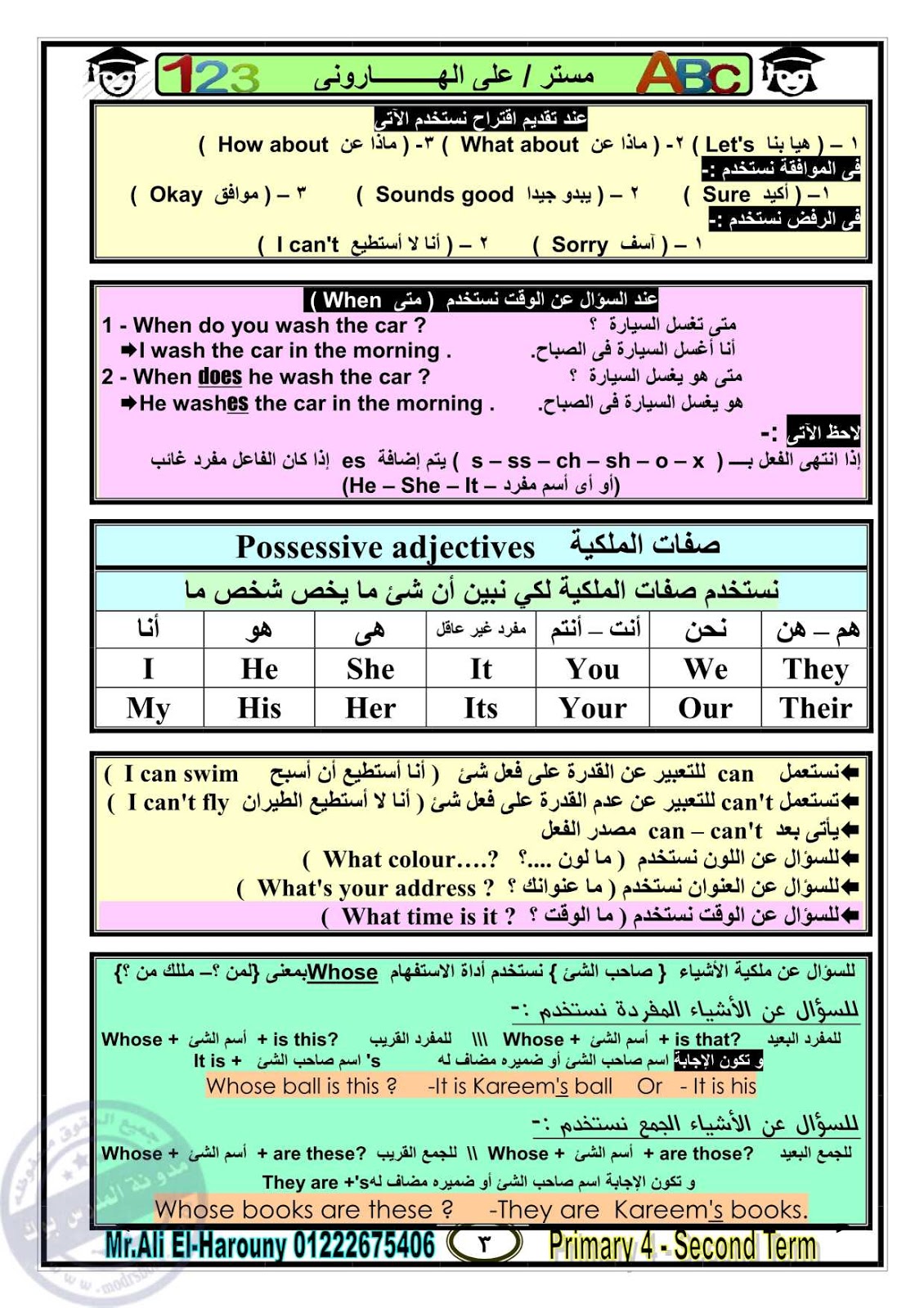 شرح ومراجعة وتلخيص قواعد اللغة الانجليزية للصف الرابع الترم الاول