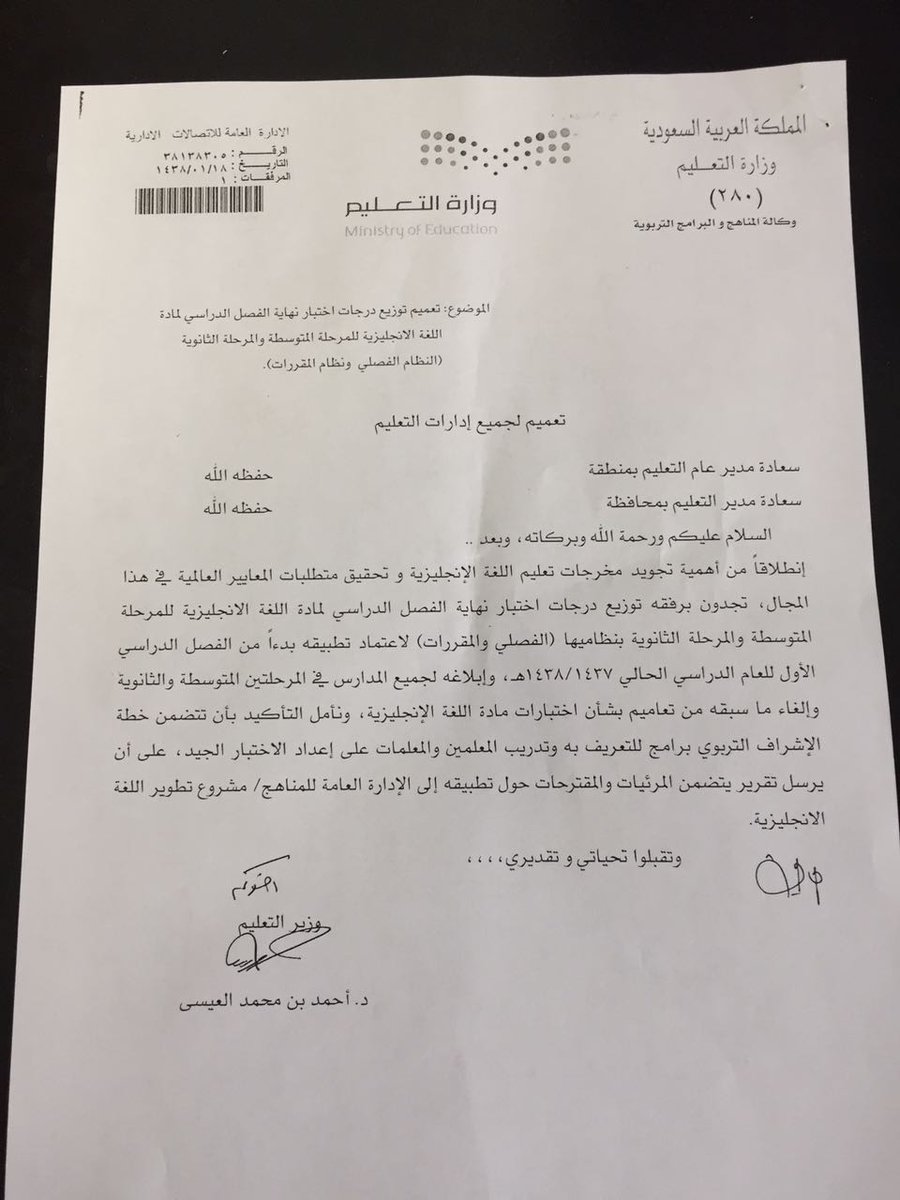 توزيع درجات اختبار مادة اللغة الانجليزية للمرحلة المتوسطة والثانوية 1441 نهاية المصدر