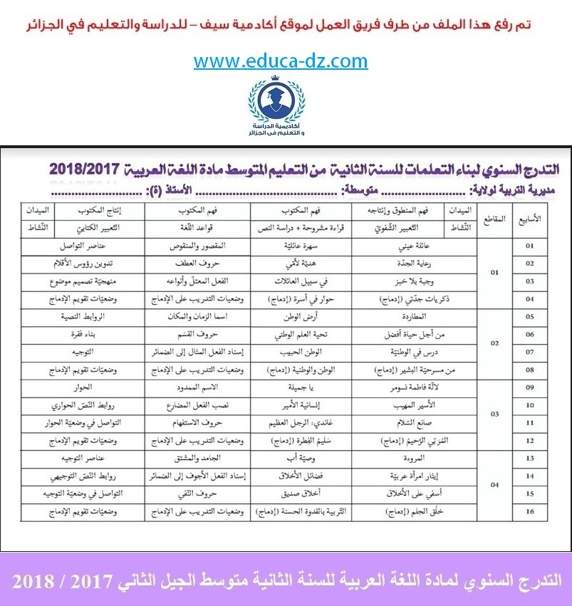 التدرج السنوي لمادة اللغة العربية للسنة الثانية متوسط الجيل الثاني 2018 2017
