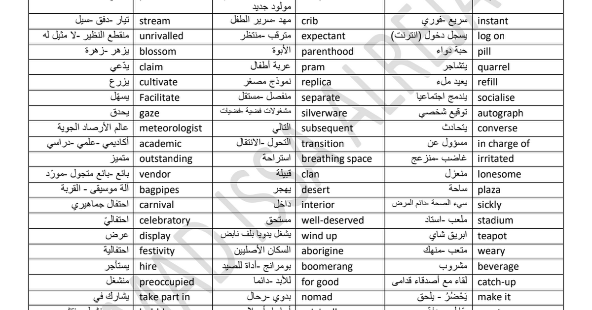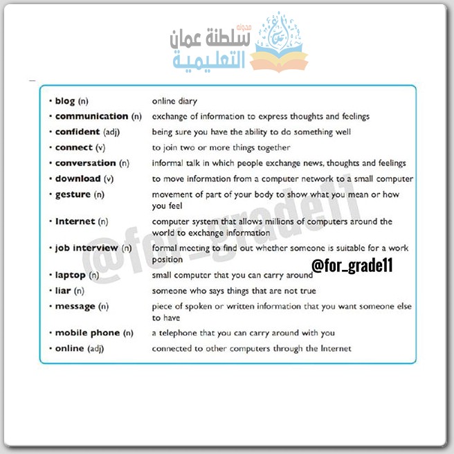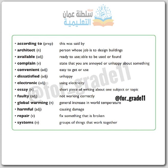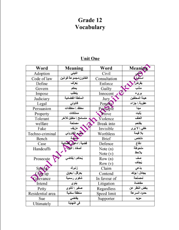 كلمات اللغة الإنجليزية للصف الحادي عشر الفصل الأول