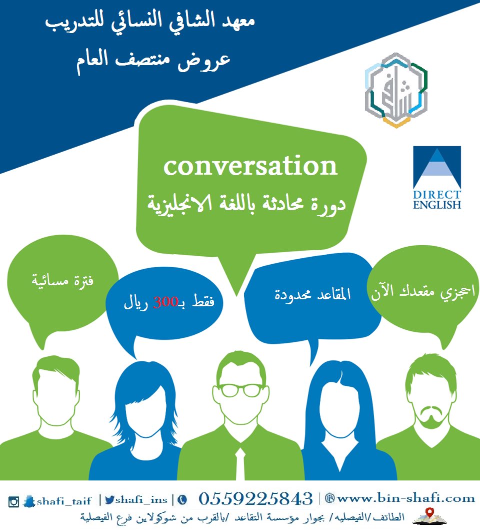 معهد الشافي للتدريب على تويتر بدا التسجيل في دورة محادثه باللغه الانجليزيه فقط ب٣٠٠ ريال لتسجيل واتس 0559225843 هاتف 0127383580 الطايف الان