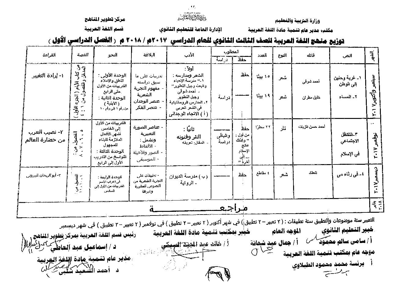 توزيع منهج اللغة العربية للصف الثالث الثانوى 2018