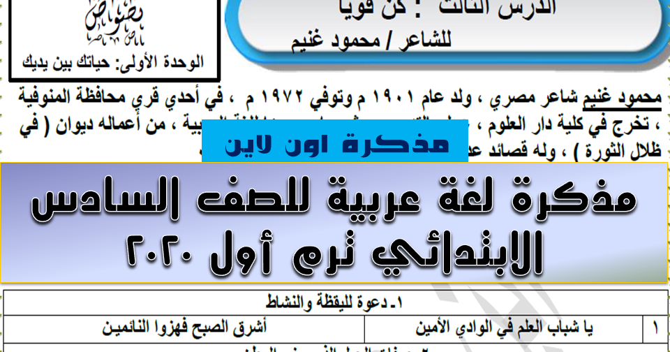 مذكرة لغة عربية للصف السادس الابتدائي ترم أول 2020