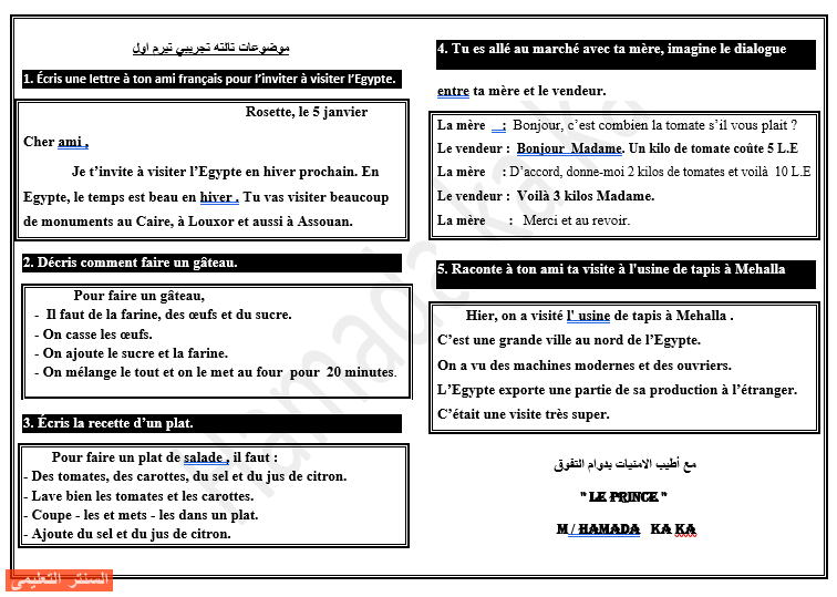 مذكرة اللغة الفرنسية للصف الاول الاعدادي الترم الاول 2021